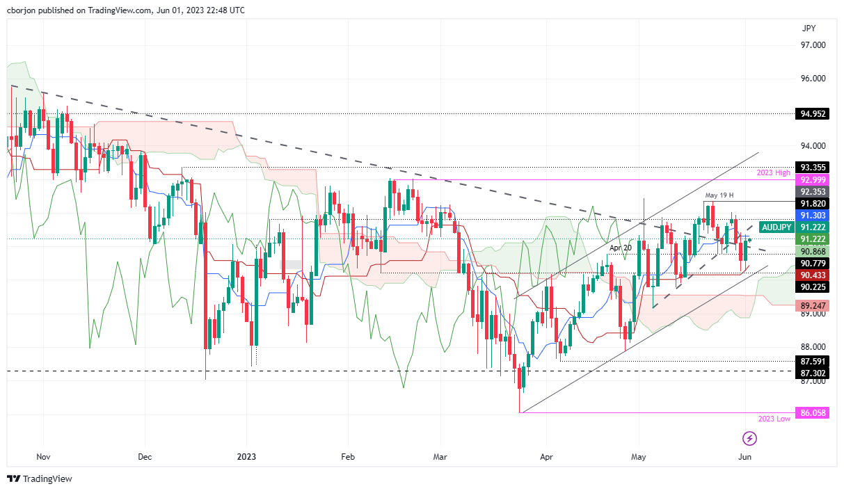 澳元/日元价格分析:美联储料将暂停加息,市场情绪改善,澳元/日元反弹突破91.00水平