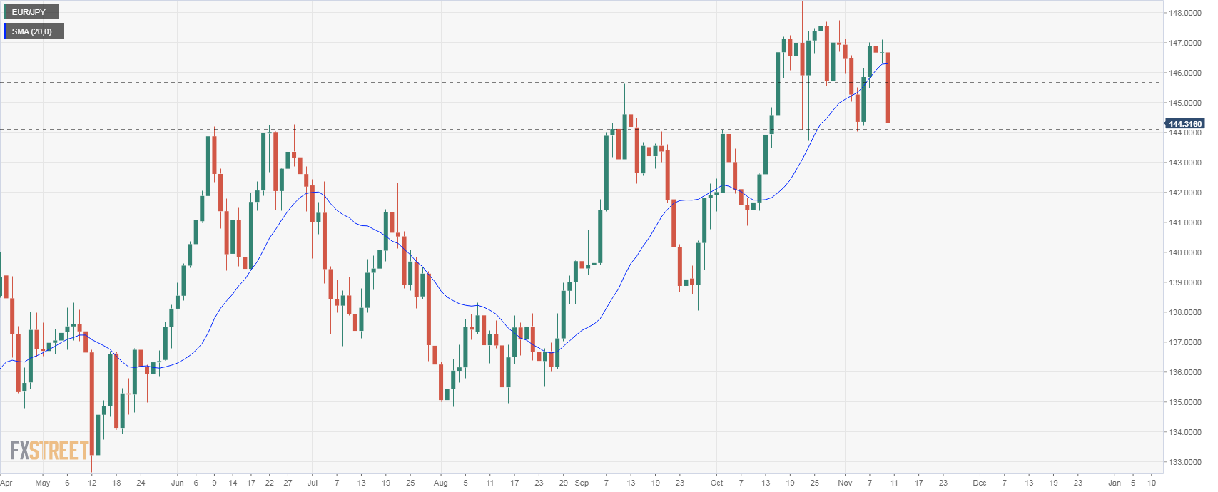 由于日元全盘走强,美国国债收益率下降,欧元兑日元录得几个月来最大日内跌幅。欧元兑日元跌至143.98点,為10月24日以来的最低水平。
