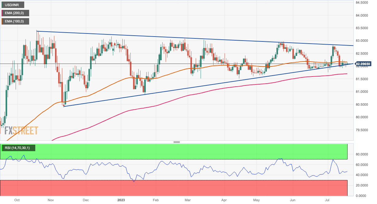 - 日缐图显示,美元/印度卢比震盪于对称三角形形态内。