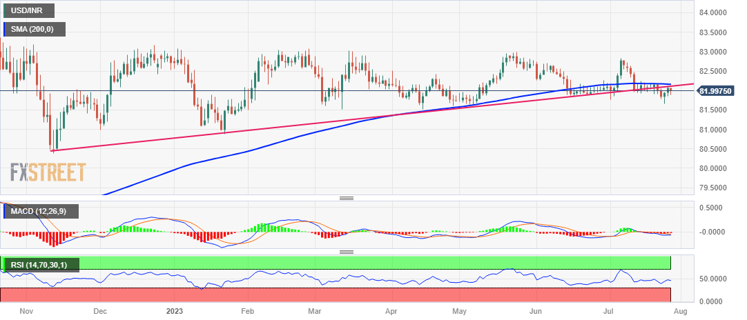 美元/印度卢比价格分析:在 82.00 附近似乎维持脆弱,可能会跌穿上升趋势缐