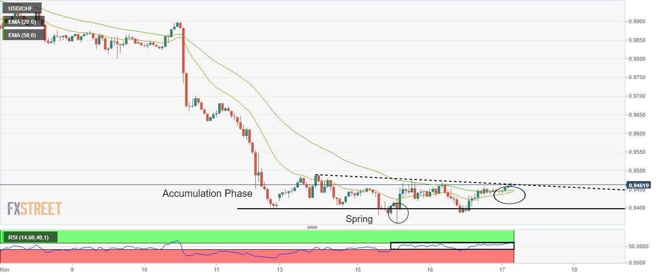美元兑瑞郎已经突破了库存积累阶段,在这个阶段,库存从散户参与者转移到机构投资者。早些时候,该资产在0.9400支撑位附近形成弹簧缐后出现了反弹。这标誌著一个卖出高潮,随后是一个响应性的购𧹒行动。