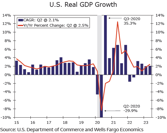 今天发布的修正数据显示,第二季度实际GDP年化增长率為2.1%,比最初估计的2.4%略有下调。总的数据下只有细微的变动。具体来说,企业固定投资在二次数据中表现疲软,因為结构投资的向上修正被设备和知识产权支出的向下修正所抵消。由于季度进口数据现在与月度数据更加一致,净出口也略微拖累了整体增长(0.2个百分点)。