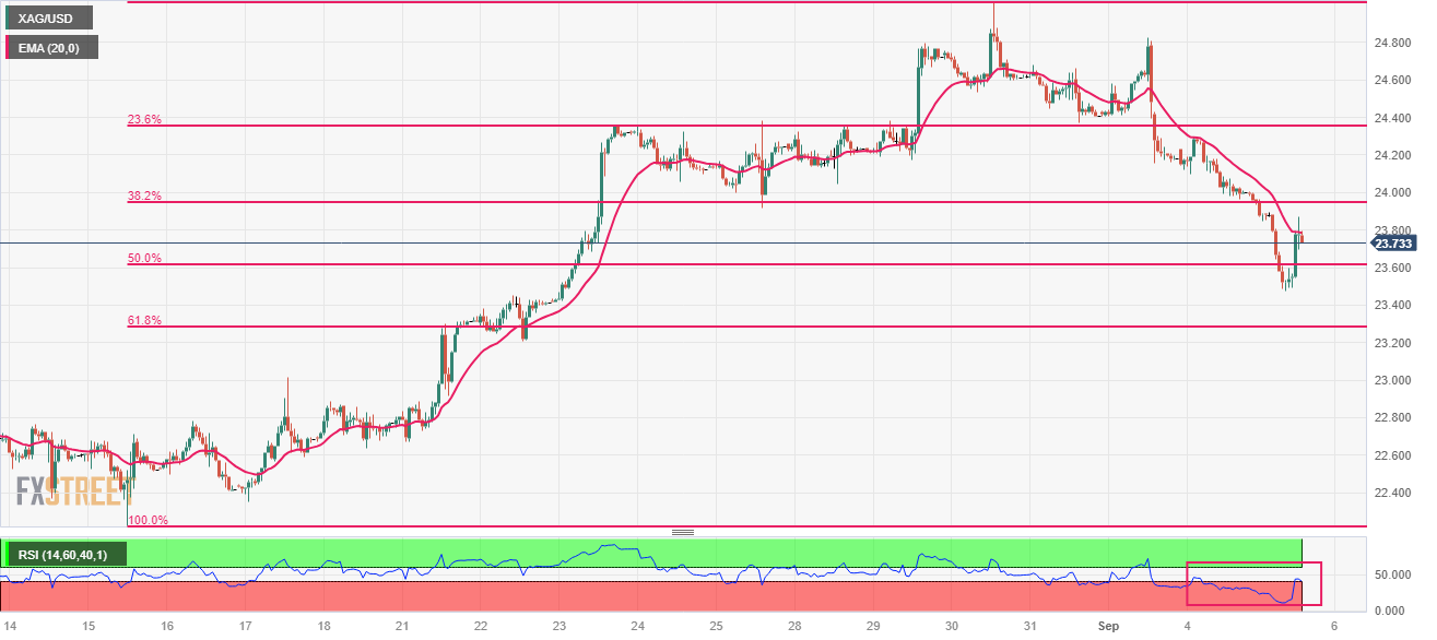 银价出现均值回归,接近 23.80 美元附近的 20 期指数移动平均缐 (EMA)。该资产在测试 50%斐波那契回撤位(从 8 月 15 日低点 22.23 美元至 8 月 30 日高点 25.02 美元的涨势)23.62 美元后试图回升。