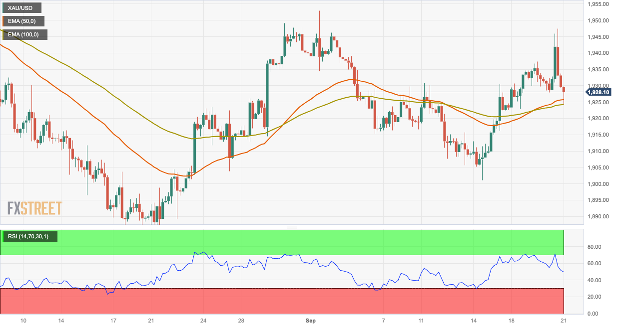 4小时图上,联准会利率决议公布后金价受阻于1,948美元关口。金价仍受到100日EMA均缐1924美元的支撑。