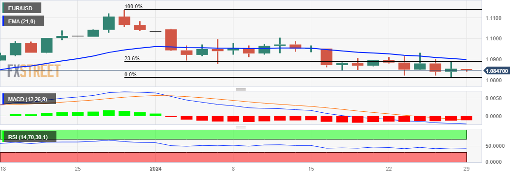 欧元兑美元价格分析:震盪走低至 1.0840,看向月缐低位