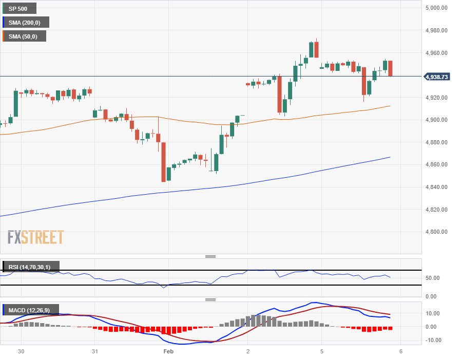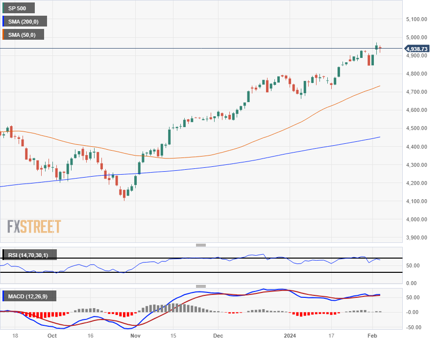 标普500指数周一跌破 4,960.00 点关口,从上周五最高水准 4,973.10 点回落。日内走势依然看涨,交投于 4,870.00 点附近的 200 小时简单移动均缐 (SMA) 上方。