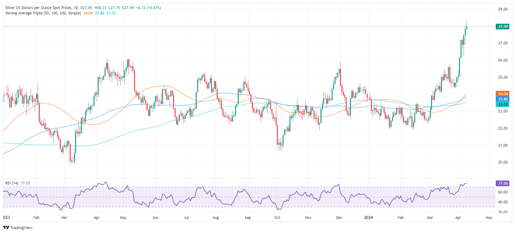 日缐图显示,白银/美元 可能会继续反弹突破 28.00 美元,侭管相对强弱指数(RSI)转為超𧹒,刺激了回调。这可能被视為交易者在获利了结。
