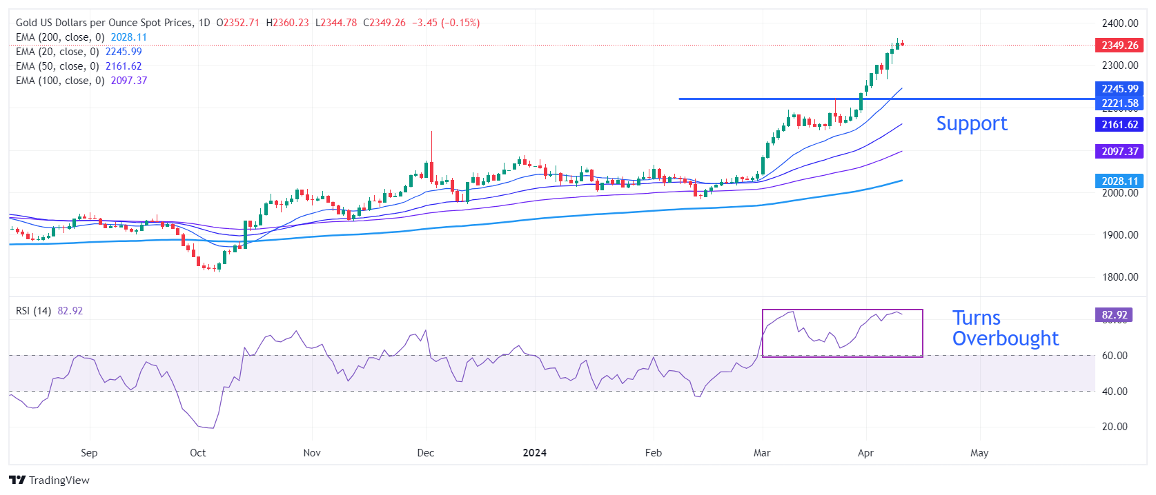 - 美国3月通膨数据公布前市场情绪谨慎,金价略低2,365 美元的历史新高。过去几周,该贵金属经历了一轮大牛市。然而,由于动量震盪指标在达到极度超𧹒水平后预计会回落,而且强劲的薪资数据动摇了投资者对联准会 6 月降息的信心,因此金价可能会出现修正。