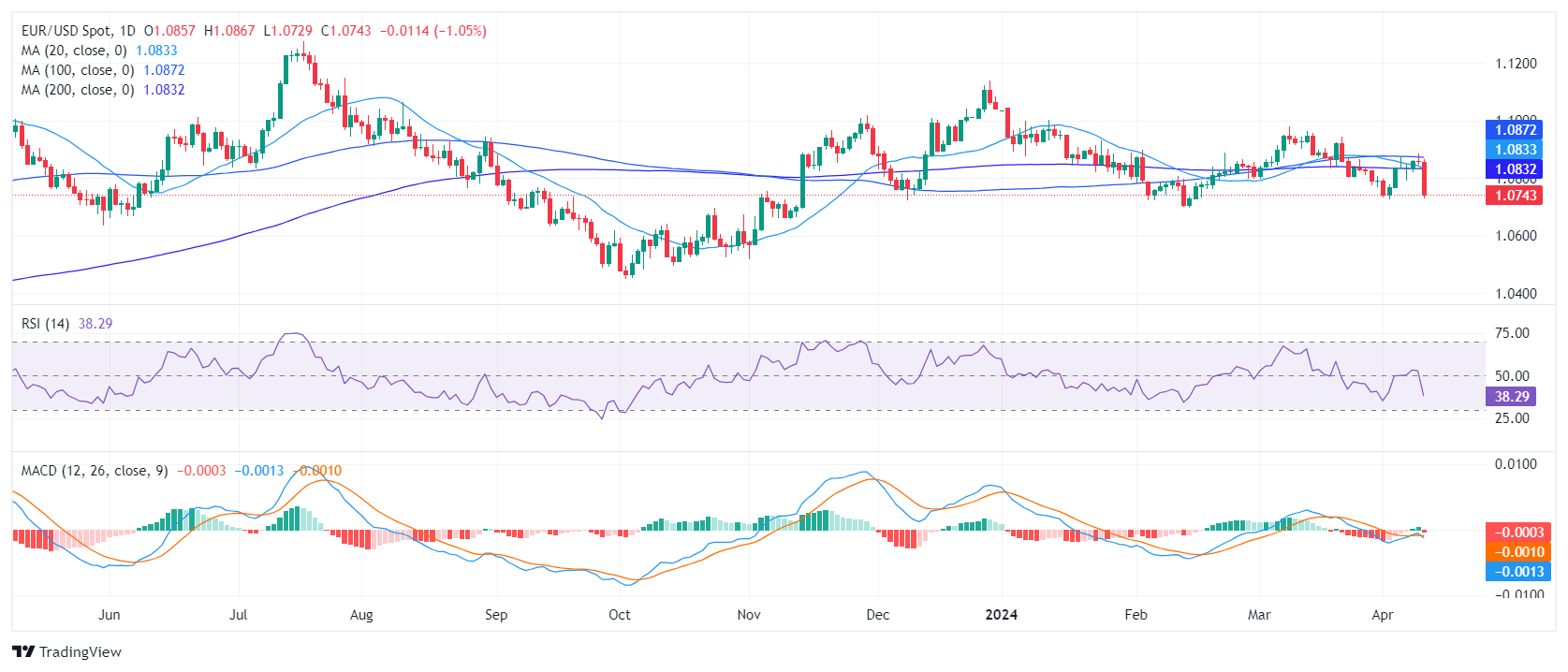 欧元兑美元下跌至 1.0739,大幅下跌 1.1%,发稿时处在1.0740。这一跌势是在美国公布的通膨数据后出现的,这些数据助长市场对联准会(Fed)的鹰派押注。 3月联准会会议纪要没有引起市场任何反应。