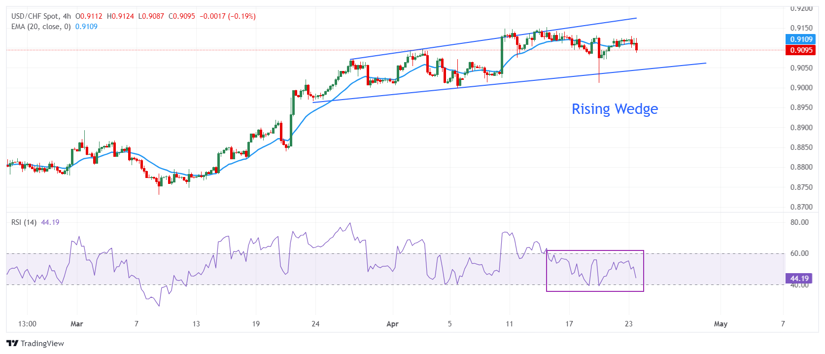- 美元/瑞郎在 0.9100 上方面临压力,因為美元在疲软的 4 月份标普全球采购经理人指数数据后下跌。
