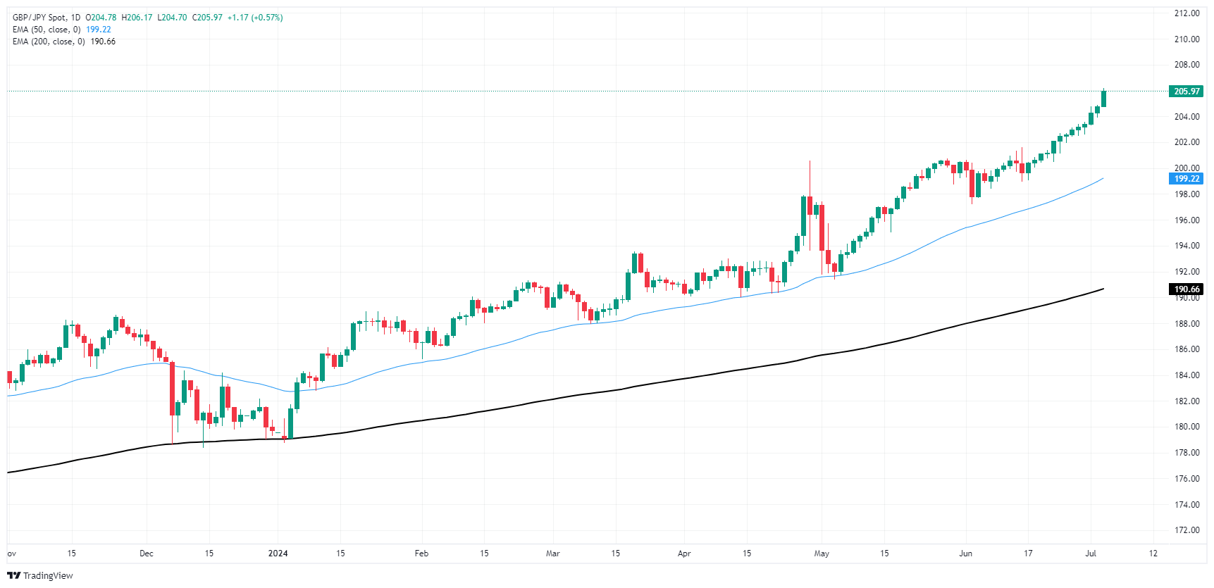 英镑/日圆看涨动能进一步加快,周三提振英镑/日圆突破206.00关口,连续第13个交易日收涨。