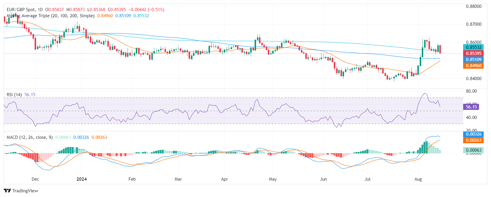 最近几个交易日,欧元/英镑走势不一,相对强弱指数(RSI)从 50 点中位移至 50 点高点。这表明交易者普遍看涨或持中性态度,但由于该指数目前指向下方,这可能暗示卖家即将到来。移动平均收敛背离指标(MACD)也支持这一观点,该指标显示红色长条图不断减少,预示著看跌情绪可能转向。过去一周的成交量保持稳定,显示该货币对的流动性尚可。