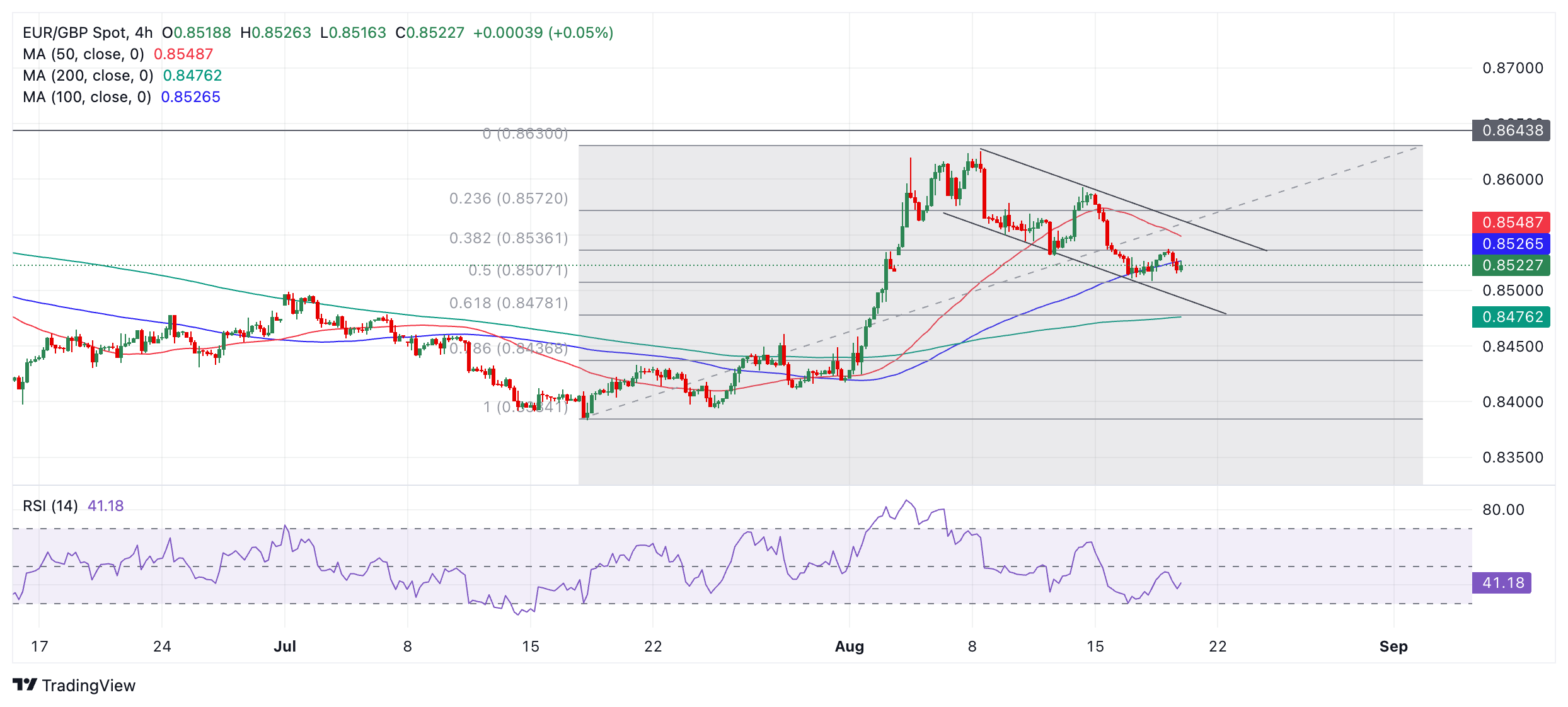 欧元/英镑形成了一个下降通道,周一触及 0.8507 附近的新低。这也是之前走势的中点,即从 7 月 17 日低点反弹的 50% 斐波那契回撤位。