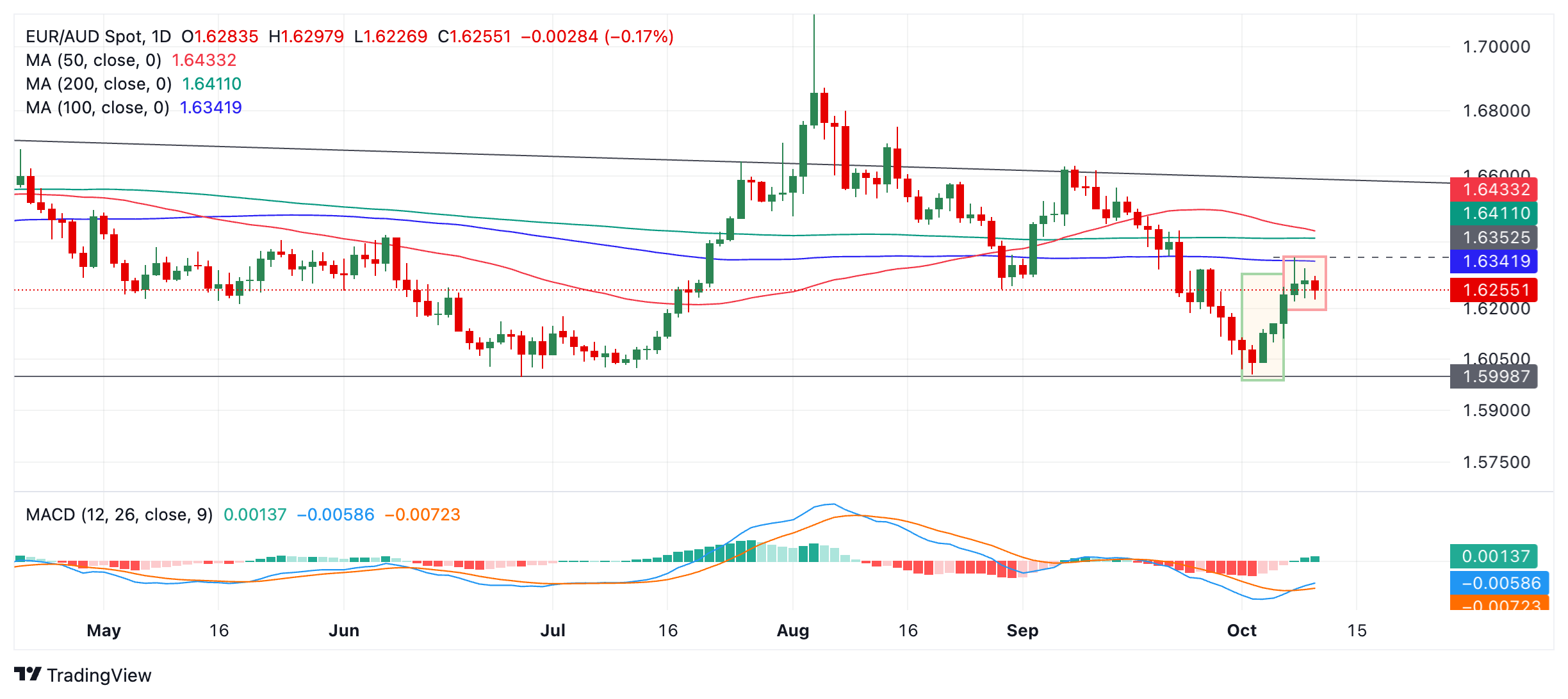 欧元/澳元在 10 月 3 日触底后形成看涨的日本三白兵蜡烛图形态(图表上的绿色阴影矩形),显示短期趋势可能逆转。在下跌趋势之后,当连续三个上涨日形成时,就会出现这种形态。