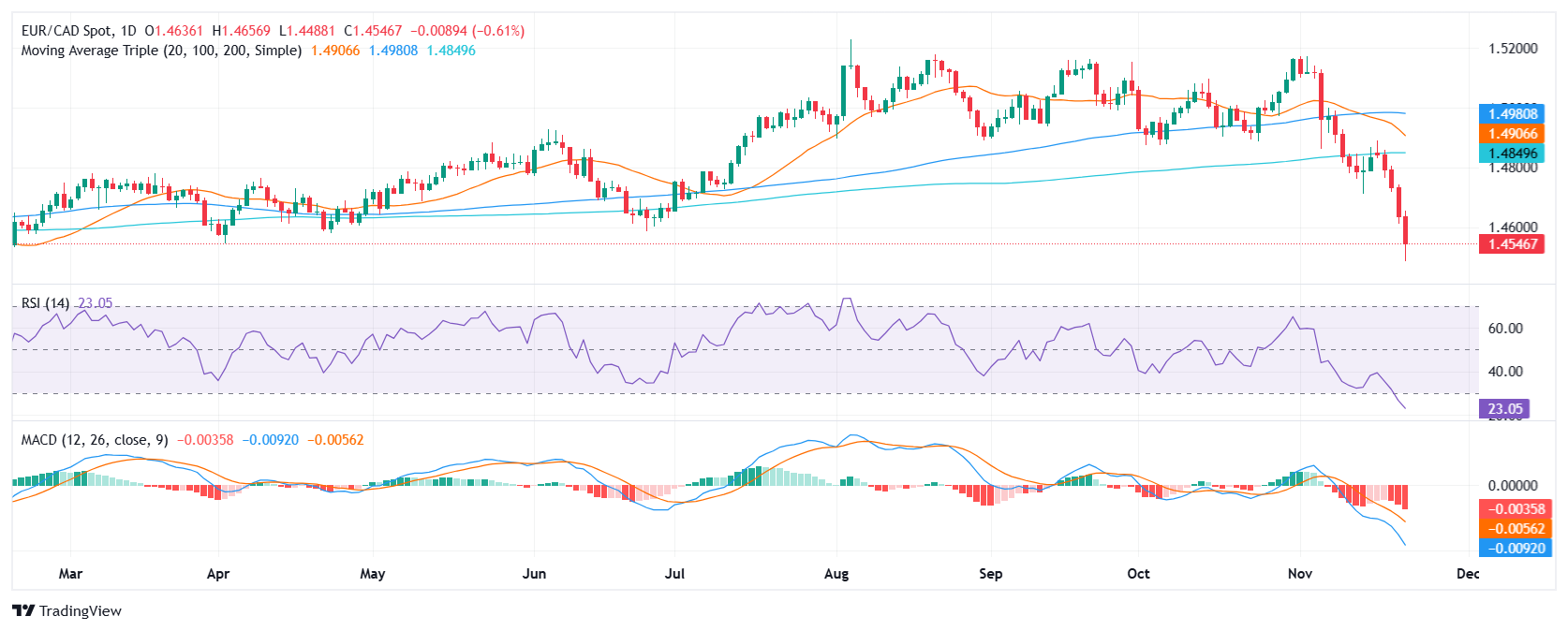 - 欧元/加元周五下跌 0.56%,交投于 1.4550 附近。