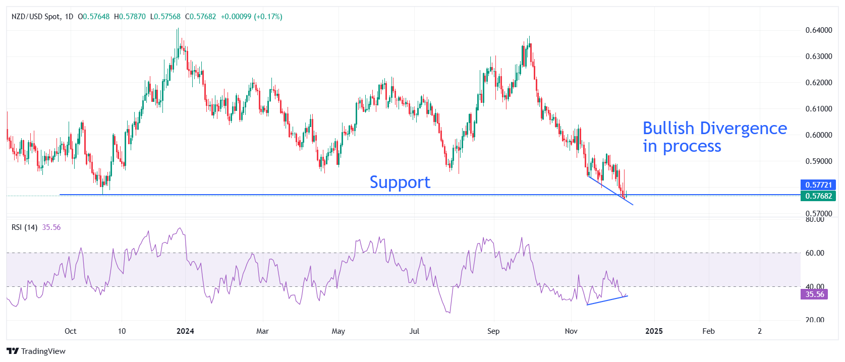 纽元/美元日图显示看涨者背离,这表明卖出动能放缓导致逆转走势。虽然该资产在日缐时间框架上形成了较低的低点,但 14 天相对强弱指数(RSI)却出现了较高的低点。该形态需要确认才能掀起看涨逆转。
