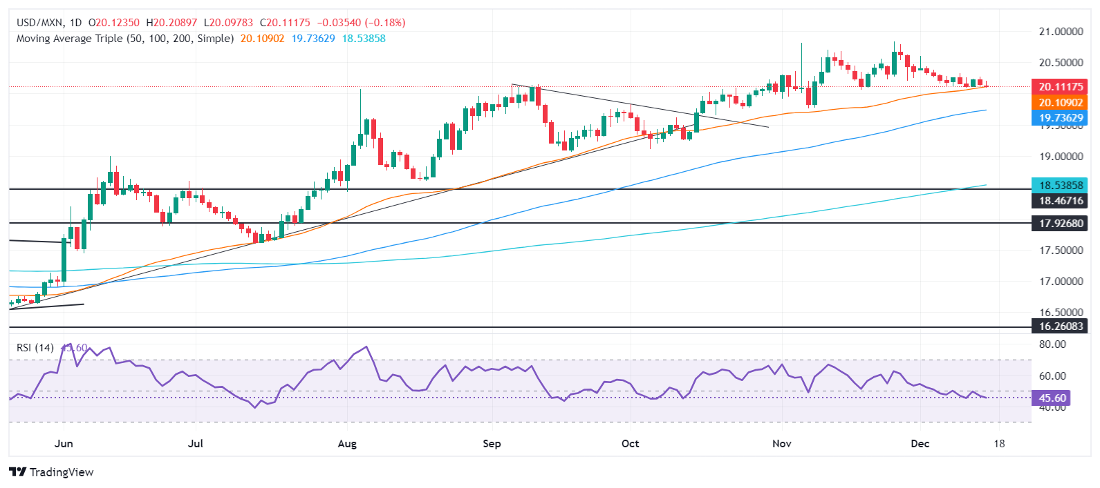- 墨西哥比索徘徊在20.11的50日简单移动平均缐(SMA)附近,在美国PMI数据公布后,美元/墨西哥比索几乎没有波动。