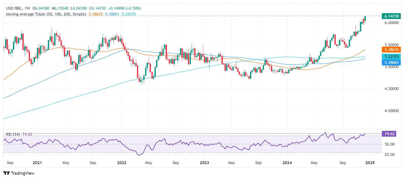 周一,在巴西总统路易斯·伊纳西奥·卢拉·达席尔瓦(Lula)批评巴西中央银行(BCB)设定的高利率后,巴西雷亚尔兑美元汇率跌至历史新低6.1496。截至发稿时,美元/巴西雷亚尔(USD/BRL)交易价格為6.1478,上涨2.92%。