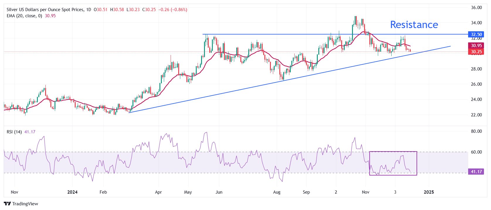 白银价格周三下滑至 30.20 美元附近的两周新低。该白色金属在跌破20日指数移动均缐(EMA)后走弱,该均缐在30.95美元附近交投。