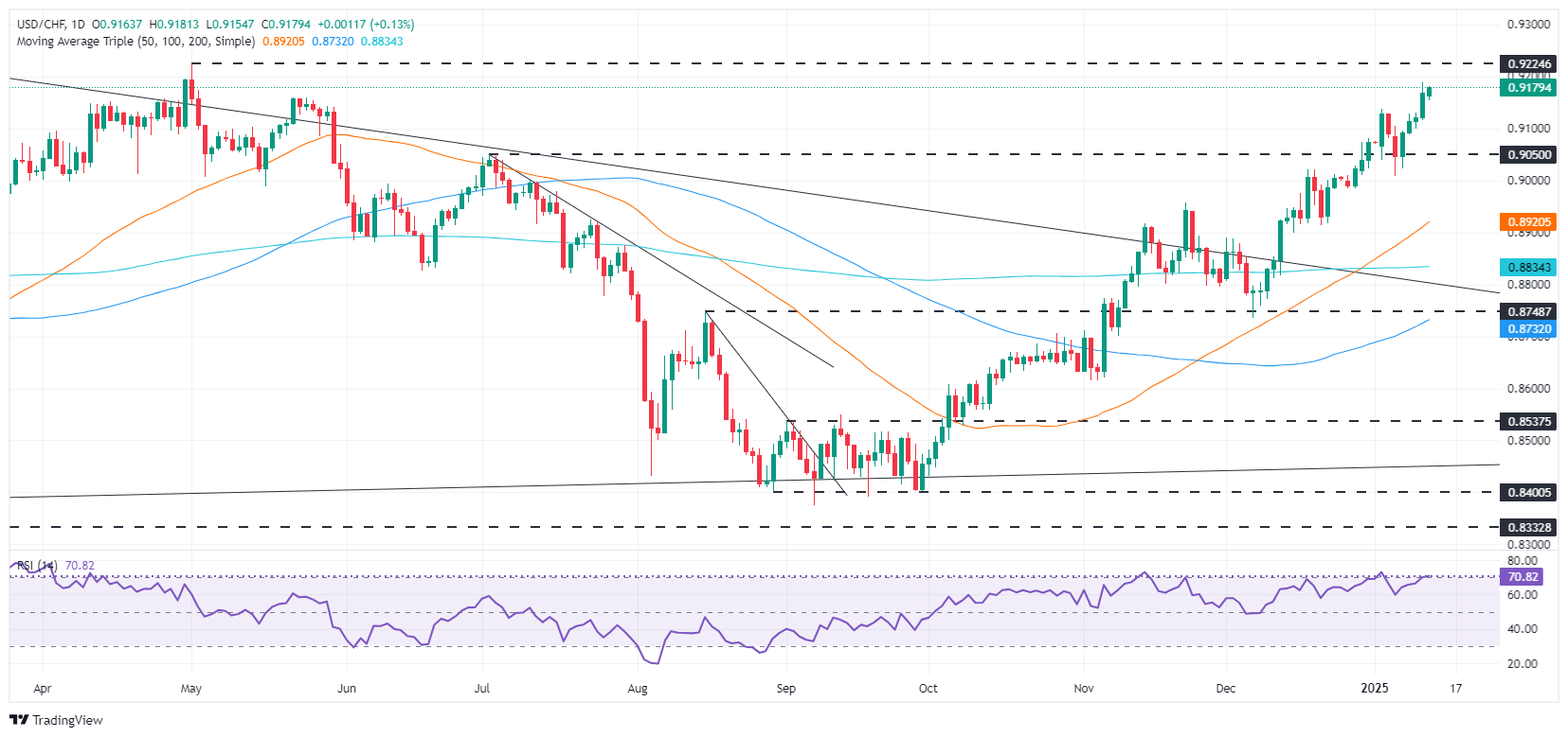 如果美元/瑞郎突破0.9200,这可能為测试2024年4月高点0.9224铺平道路。进一步走强的目标位在0.9250,然后是0.9300。