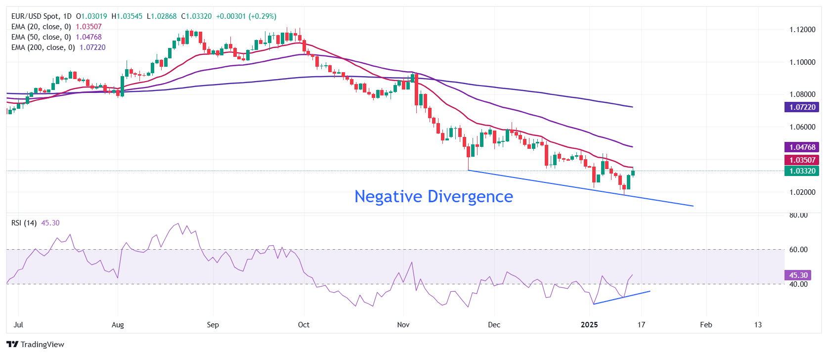 - 欧元/美元因美元(USD)走软而攀升至接近1.0350。周三,欧元(EUR)对主要对手货币表现疲软,因為投资者在当选总统唐纳德·特朗普重返白宫前保持谨慎。特朗普政府的更高进口关税预计将削弱欧元区的出口,使其对美国进口商来说更昂贵。