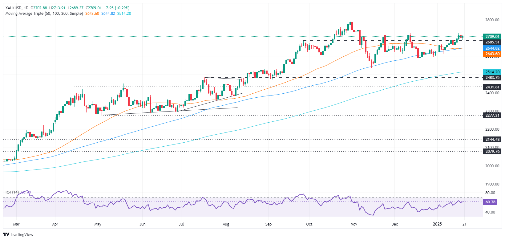 周一,在唐纳德·特朗普宣誓就任美国第47任总统后,金价在流动性稀缺的情况下适度上涨。特朗普在演讲中搁置了其激进的关税政策,导致美元走软,这可能会刺激通胀并阻止美联储(Fed)放鬆政策。截至发稿时,黄金/美元报 2,709 美元,上涨 0.27%。