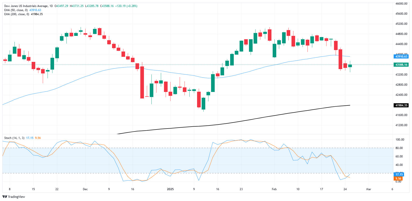 - 道琼斯指数在周二测试了新低,但仍然徘徊在43,500附近。