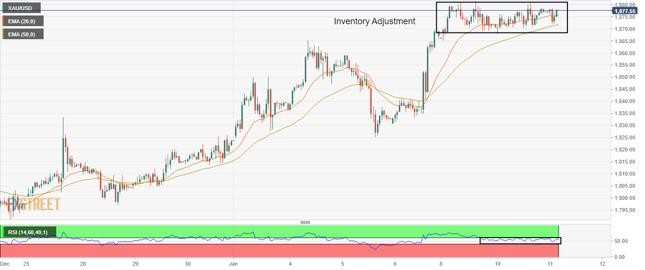 一小时图显示,金价强势上扬后处于库存调整阶段。该贵金属在美国通胀数据公布后可能取得果断行情,因此很难将其定义為累积或派发。 20EMA均缐位于1,875.50美元,為黄金多头提供支撑。金价仍未触及位于1,871.90美元的50EMA均缐,表明上行倾向依然强劲。