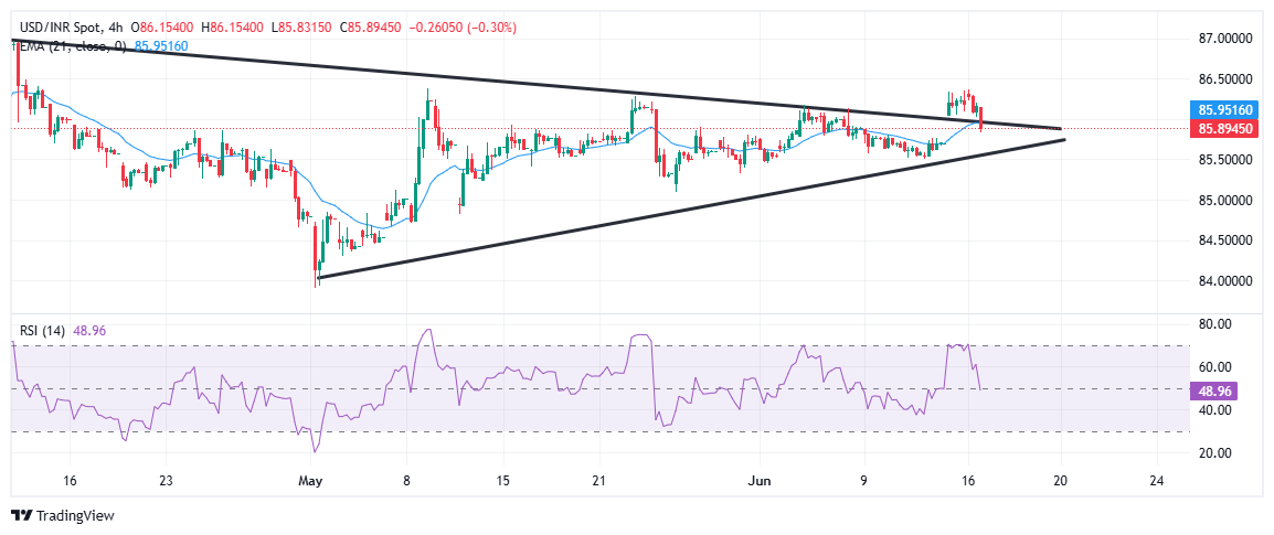 美元/印度卢比最近突破了4小时图上的多周对称三角形模式,发出短期偏向可能转变的信号。然而,在接近86.50后,价格在上方趋势缐附近难以维持动能。目前该货币对徘徊在85.89附近,略低于21期指数移动平均缐(EMA)85.95,表明𧹒方力量减弱。只要价格保持在该移动平均缐支撑之上,仍然有轻微的优势。