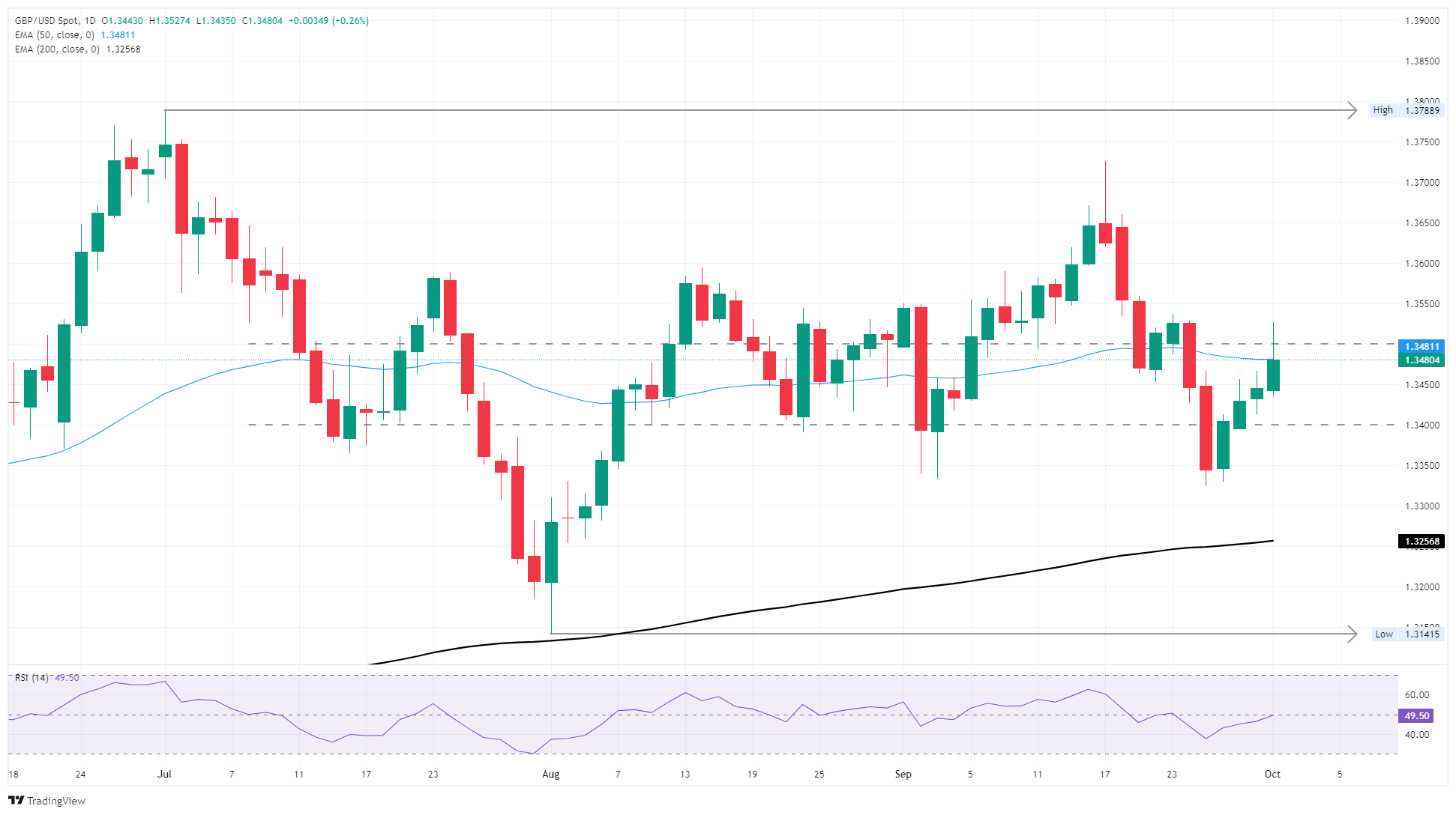 英镑/美元进入第四个连续看涨的交易日,短暂触及1.3500关口后,最终回落至当天市场交易的0.27%的温和涨幅。英镑交易者现在进入交易周后半段,面临美国政府关门威胁,这将影响高质量官方劳动和通胀数据的流动,同时英国方面也缺乏有意义的经济数据发布。