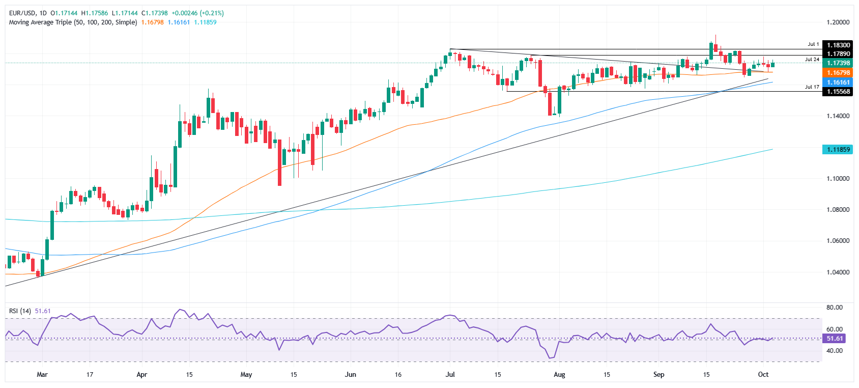 由于缺乏新的催化剂,欧元/美元在周五的交易时段中盘整,受到美国政府关门的影响,似乎将延续到本周。该货币对在撰写时交易于1.1738,上涨0.28%。