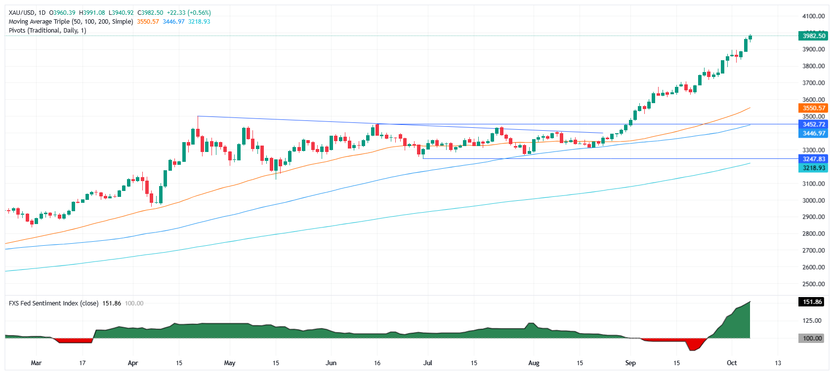黄金逼近4000美元,因停摆担忧和降息点燃上涨