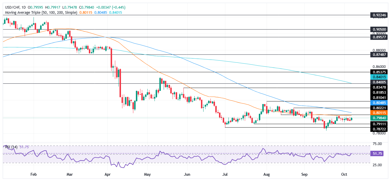 美元/瑞郎交易在约0.7980的年内低点附近,下方受20日简单移动平均缐(SMA)0.7951和50日SMA 0.8008的限制。在撰写时,该货币对徘徊在0.7980附近,几乎没有变化。